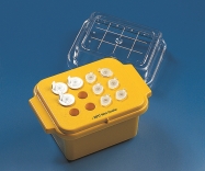Mini-cooler portaprovette, in PC, con coperchioMini refrigeratore in PC, resistente policarbonato, riempito con gel atossico. Possono contenere 12 provettine da ml 0,5 a 2. Mantengono la temperatura fredda sul banco di laboratorio. | |||||||||||||||||||||||||