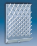 Scolavetreria in polistirolo antiurto, costituita da una piastra di supporto dello spessore di 4 mm stampata in sol pezzo, con 72 fori a fondo cieco per l'inserto dei relativi pioli. Il canale di drenaggio senza linee di giunzione convoglia il liquido nel foro di drenaggio.